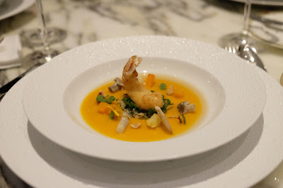 可以說是一份藝術品,以蔬打成的啫喱,以炸蝦及食用花置面,口感複雜多變,真是很有趣的體驗。