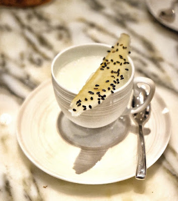 雪白的泡沫,瀰漫著幽幽的蘑菇香氣,有種似有還無的質感,然而口腔內卻充滿了濃郁的蘑菇味道,用一片薄脆蘸點,在口裡迸裂的感覺很有趣。