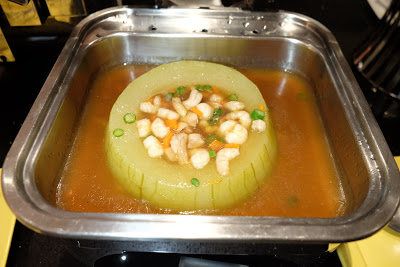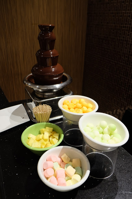 有菠蘿、哈蜜瓜、棉花糖同蜜瓜粒,將蜜瓜放入濃稠的朱古力漿內打轉,吃的時候,外面濃香而內裡甜美,想想也在流口水。