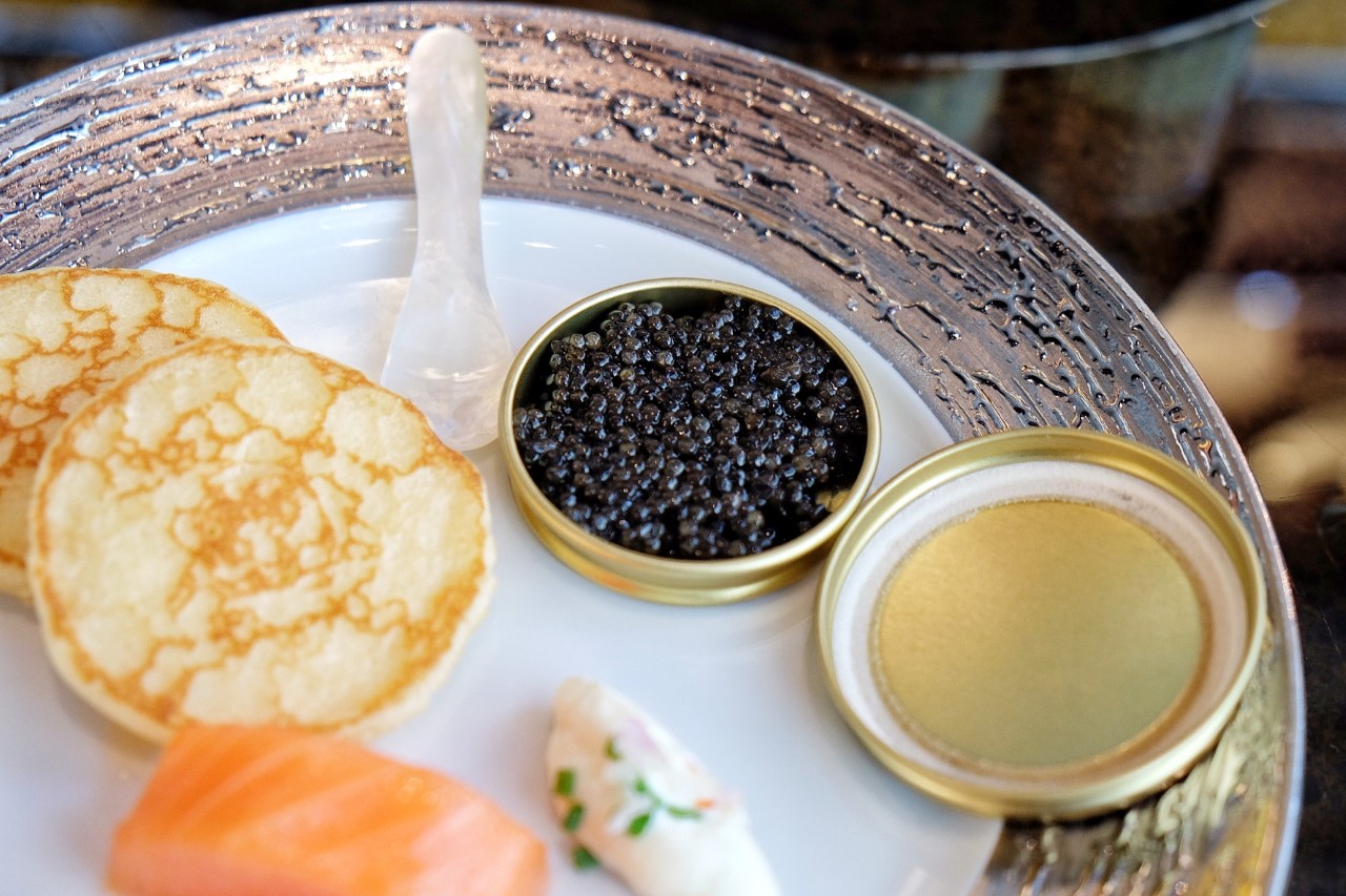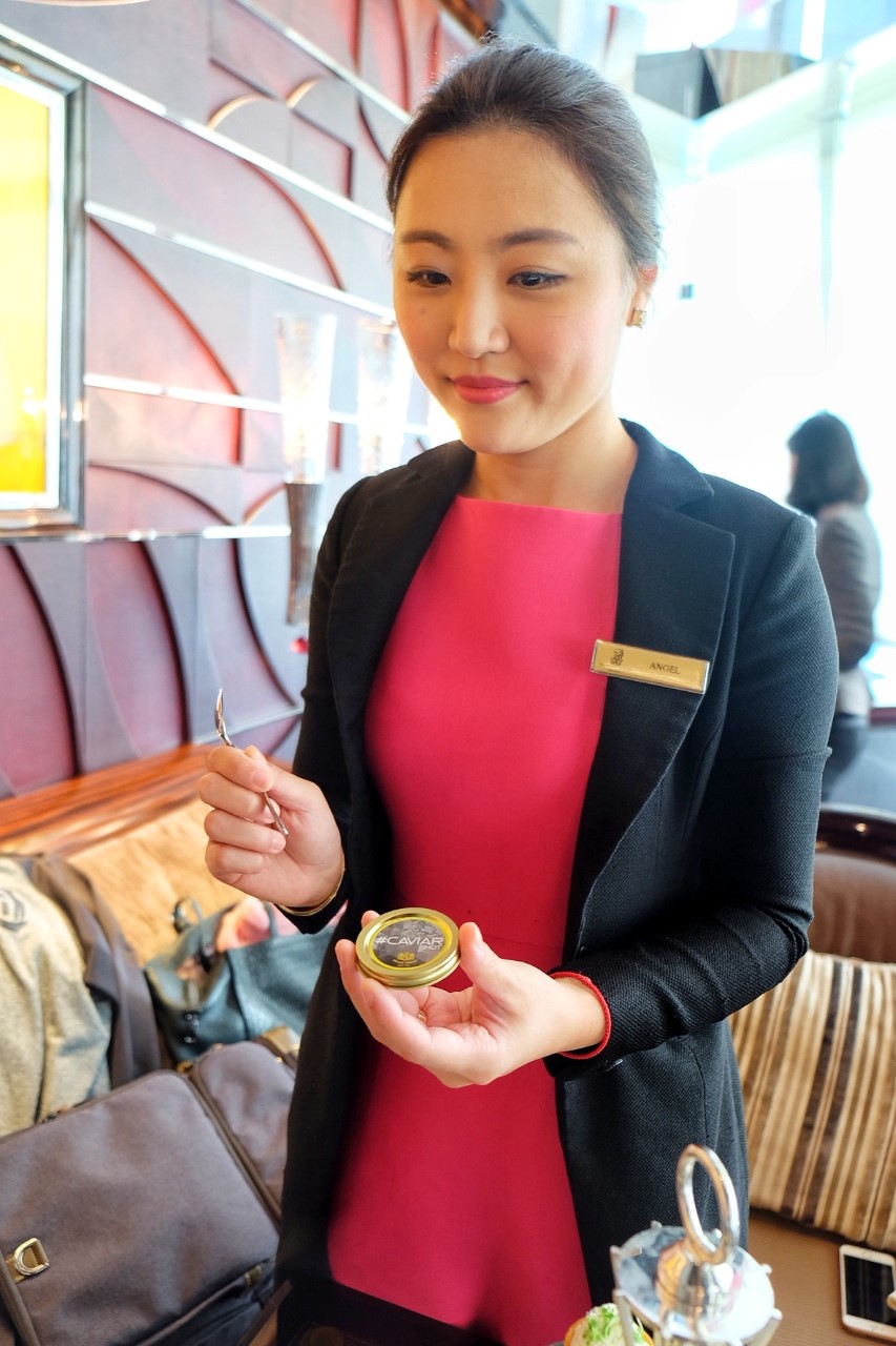 餐廳有專人教導客人開啟魚子醬罐,原來要先用茶匙輕輕敲打罐面,防止魚子醬沾在罐面,然後再用茶匙撬開罐蓋,實在很有趣。