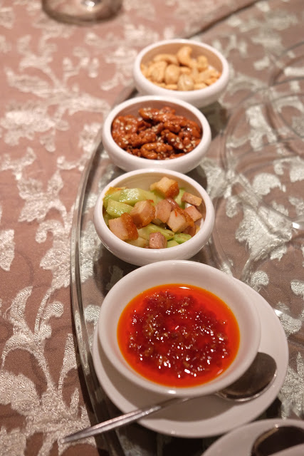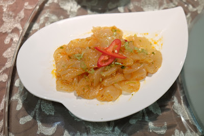 前菜之中,海蜇最常見,尤以海蜇頭最爽口彈牙,海蜇本身無乜味,主要是靠醬油的調教,老實講,食落帶點麻辣,刺激了食慾;車厘茄以話梅汁醃漬過,酸酸甜甜的又多汁,很醒胃提神。