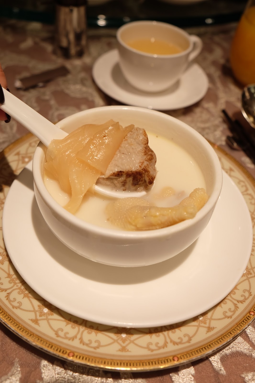 色澤奶白,一揭開盅蓋,陣陣杏香隨之而來,呷一口醇厚芳香,鮮甜潤滑,豬肺汆水足,沒過份的羶味,花膠燉至軟稔,膠質都跑進湯裡,真是用時間換來的美味。
