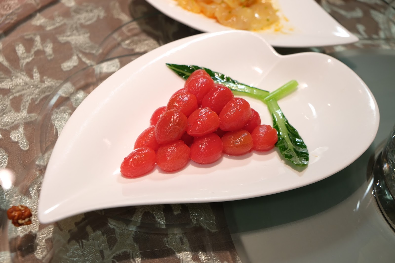 前菜之中,海蜇最常見,尤以海蜇頭最爽口彈牙,海蜇本身無乜味,主要是靠醬油的調教,老實講,食落帶點麻辣,刺激了食慾;車厘茄以話梅汁醃漬過,酸酸甜甜的又多汁,很醒胃提神。