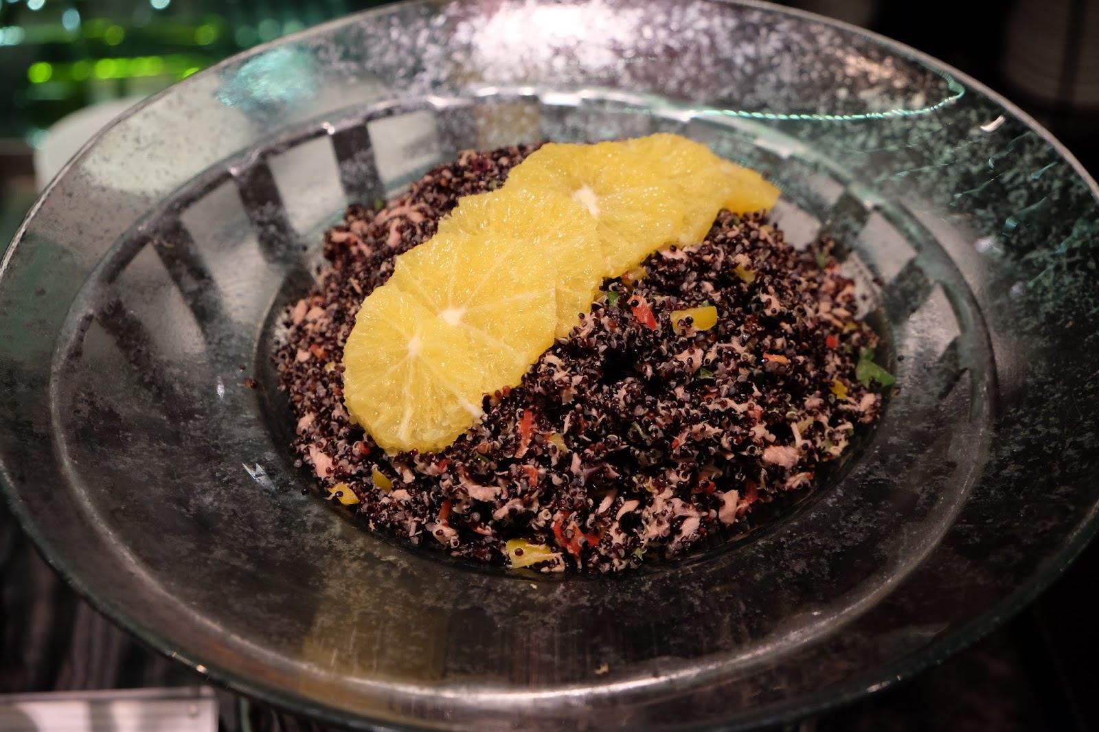 煎鵝肝配海鮮汁、木魚薄片及芝麻