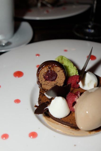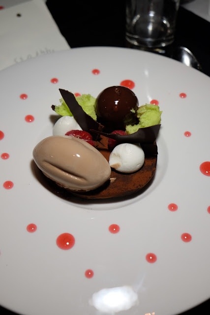 墊底是香蕉朱古力榛子撻,上面放了朱古力雪糕及草莓朱古力慕絲,賣相帶有聖誕氛圍,切開朱古力球時,內藏了草莓粒,在濃郁的朱古力味道中,滲出草莓的微酸,吃起來甜而不膩,亦是一個完美的壓軸。