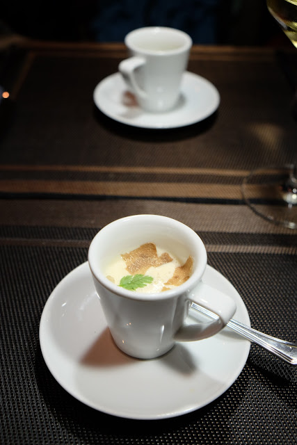 賣相小巧別緻,未入口已傳來陣陣幽香,原來是幾片即刨的黑松露,輕盈地浮在椰菜花湯面,呷一口,滑溜如絲,暖意洋溢,幸福感悠然而生。