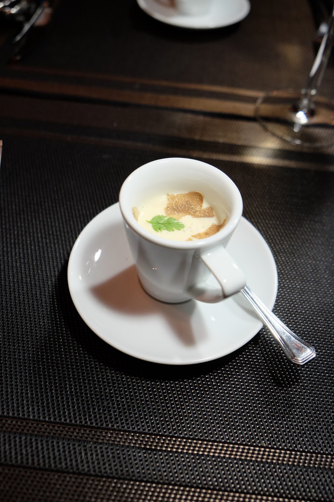 賣相小巧別緻,未入口已傳來陣陣幽香,原來是幾片即刨的黑松露,輕盈地浮在椰菜花湯面,呷一口,滑溜如絲,暖意洋溢,幸福感悠然而生。