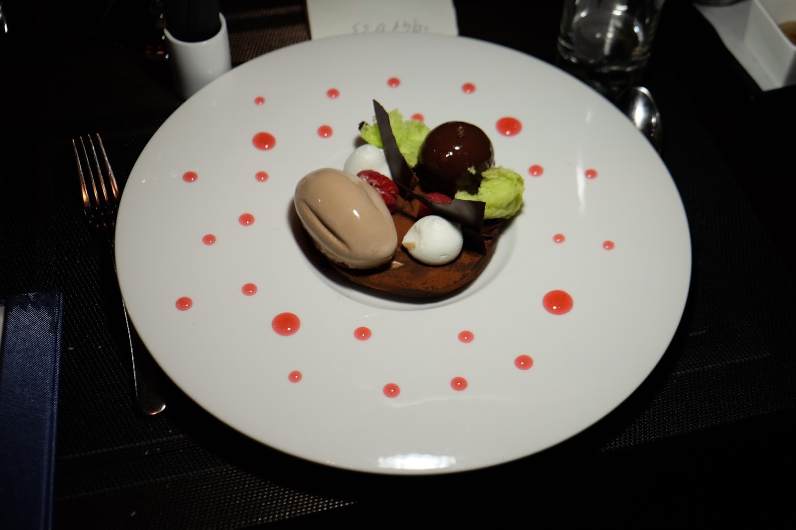 墊底是香蕉朱古力榛子撻,上面放了朱古力雪糕及草莓朱古力慕絲,賣相帶有聖誕氛圍,切開朱古力球時,內藏了草莓粒,在濃郁的朱古力味道中,滲出草莓的微酸,吃起來甜而不膩,亦是一個完美的壓軸。