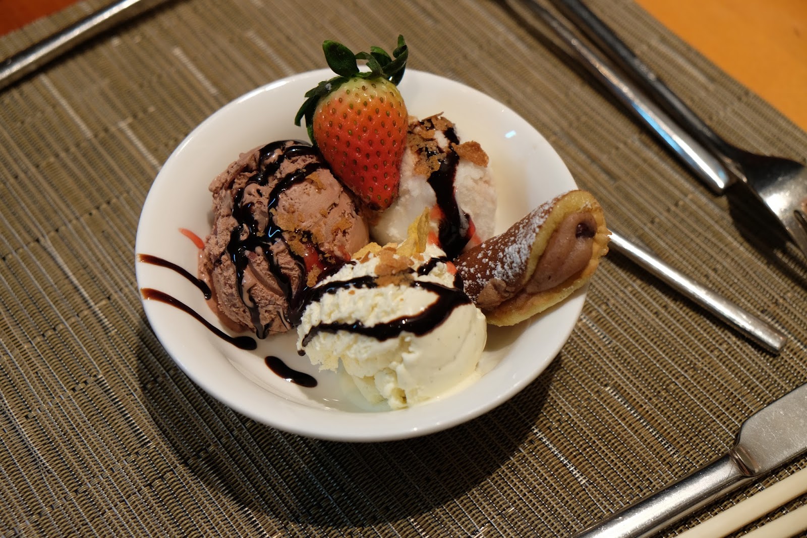 首選當然是最愛的雪糕,餐廳提供近年大熱的Movenpick,有Swiss Chocolate、雲呢拿夢幻雪糕、草莓雪糕、榛子雪糕及Yoghurt Ice-Cream共5款口味,隨意灑點 toppings點綴,賣相更佳,再加上另一款甜品紅豆噹噹福餅,真係越食越開心。