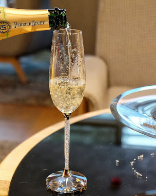 先奉上「巴黎之花」Perrier-jouet 香檳兩杯,泡沫細緻綿密而畢挺,酒體清澈,有著淡雅的金黃色,散發輕盈的花香,漂亮極了。