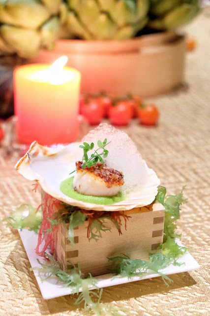 食具是日式木盒,以海草來點綴,呈現了海洋的感覺,大廚先將北海道帶子微微煎香,放上48個月的火腿茸,與及蜜瓜泡沫,質感輕柔,帶子肉質嫩滑,又有少許咸香,風味獨特。