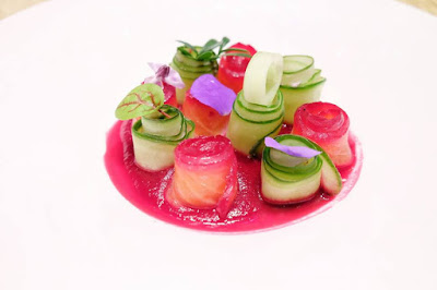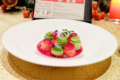 用Gin酒及石榴汁略為醃過三文魚,伴碟是青瓜卷,sauce是紅菜頭打成,紅綠相間色彩絢麗,鮮甜與清爽夾雜,味道無以尚之。