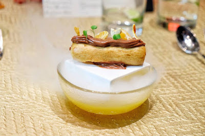 以乾冰營造出虛無縹緲的視覺效果,朱古力柑桔éclair咬落鬆化,在豐腴的味覺中,以柑桔的清香來平衡,在味道的調教上,處理得相當好。