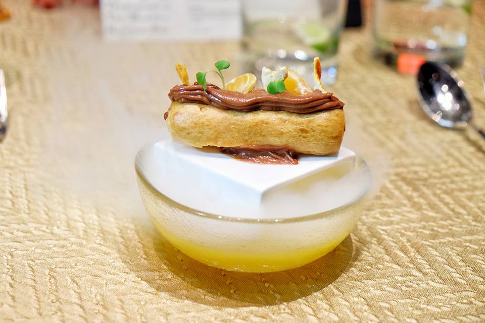以乾冰營造出虛無縹緲的視覺效果,朱古力柑桔éclair咬落鬆化,在豐腴的味覺中,以柑桔的清香來平衡,在味道的調教上,處理得相當好。