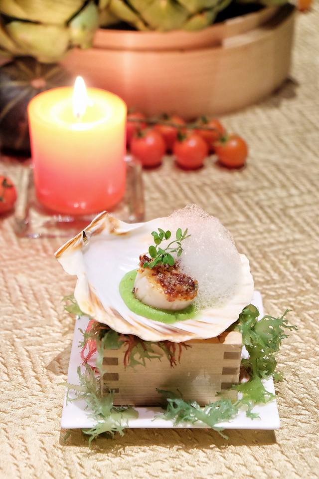 食具是日式木盒,以海草來點綴,呈現了海洋的感覺,大廚先將北海道帶子微微煎香,放上48個月的火腿茸,與及蜜瓜泡沫,質感輕柔,帶子肉質嫩滑,又有少許咸香,風味獨特。