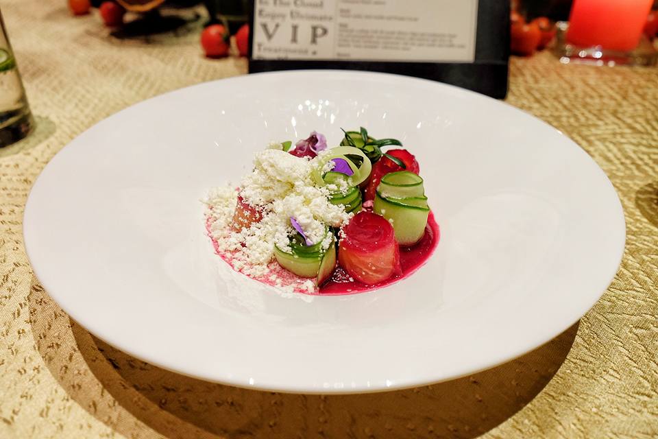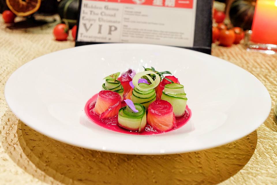 用Gin酒及石榴汁略為醃過三文魚,伴碟是青瓜卷,sauce是紅菜頭打成,紅綠相間色彩絢麗,鮮甜與清爽夾雜,味道無以尚之。