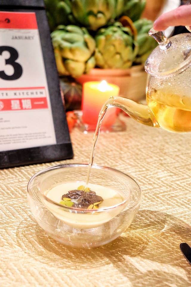 Golden Enoki mushroom consomme with foie gras royale and truffle rocks