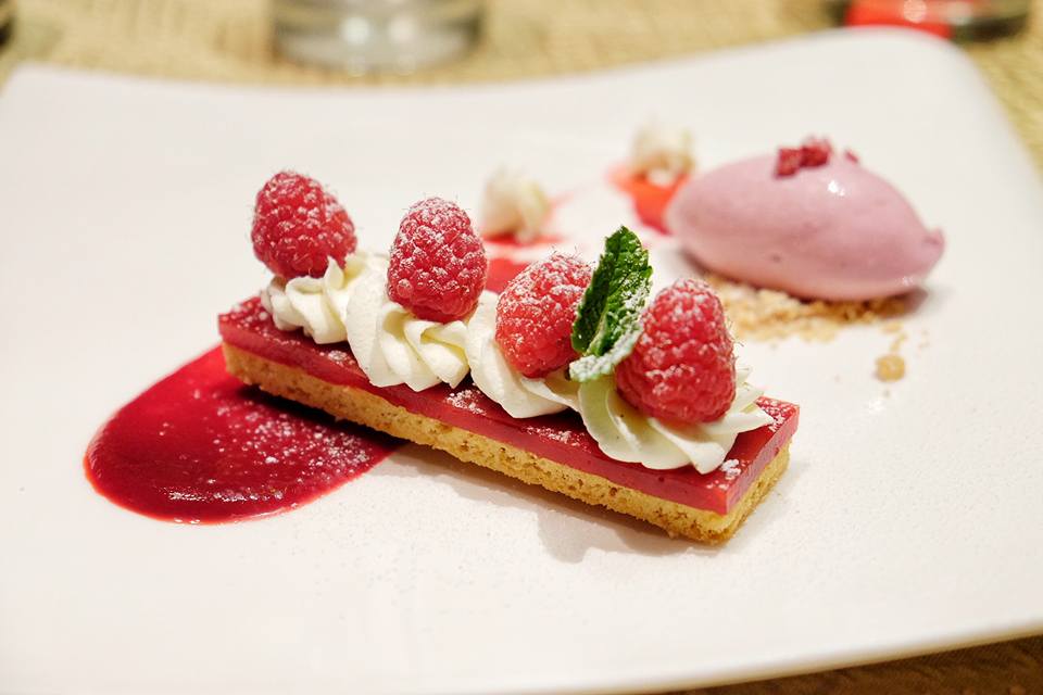 Raspberry jelly and mascarpone sable, seasonal mixed berries yogurt ice cream