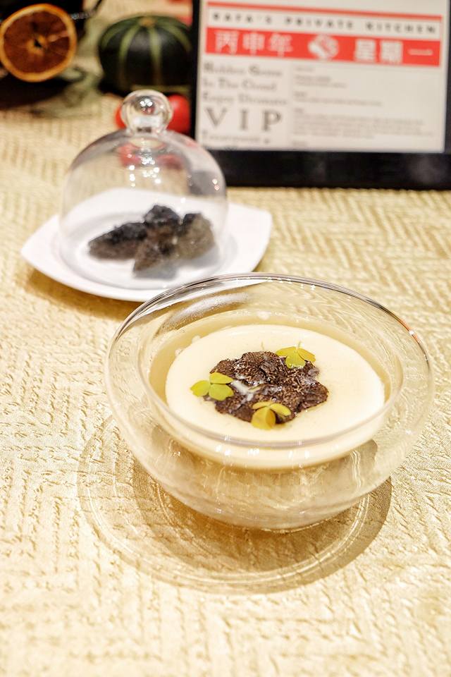 在中空的玻璃碗,放上了質感輕柔細滑的皇家鵝肝,配上幾片黑松露片,然後注入色澤金黃典雅的金菇清湯,瀰漫著馥郁的香氣,更加令人期待之後的菜色。