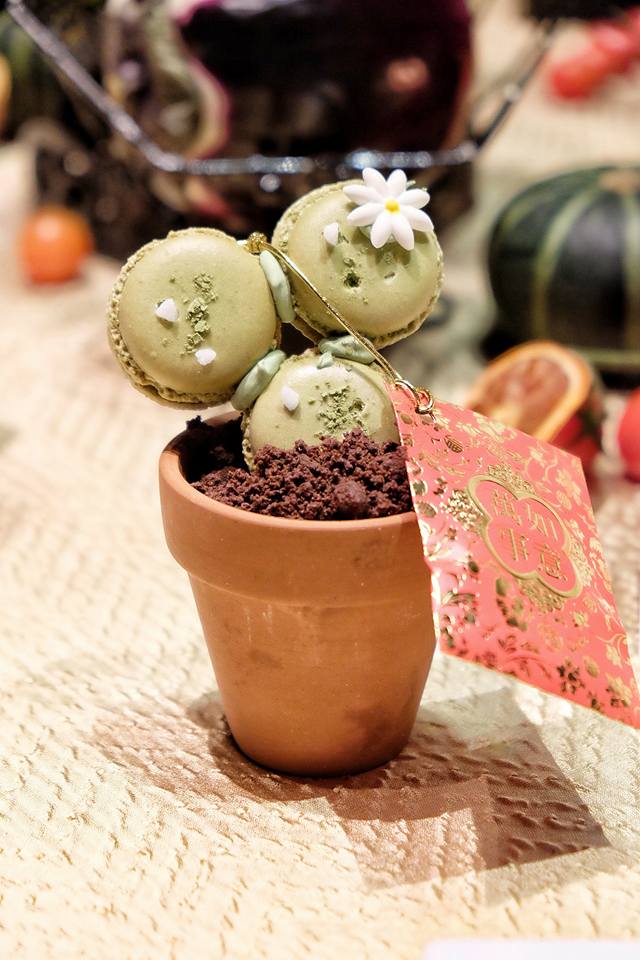 是抹茶開心果Macaroon,賣相飽滿,咬起來外脆內軟,混入了開心果粒,就更加甜美,以小花盆擺放,超萌,其實有點似米奇老鼠的頭影,掛上了利是封,更添新春氣息。