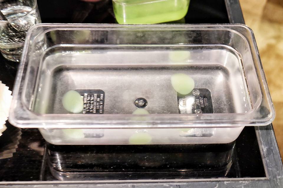 首先出場的Cocktail,已經令人有驚喜,用分子料理手法,將Mojito打造成吹彈即破的水珠,更以半開青檸作杯,在舌尖迸裂的一刻,真是充滿了玩味。