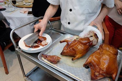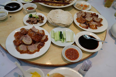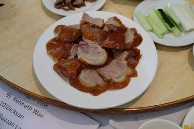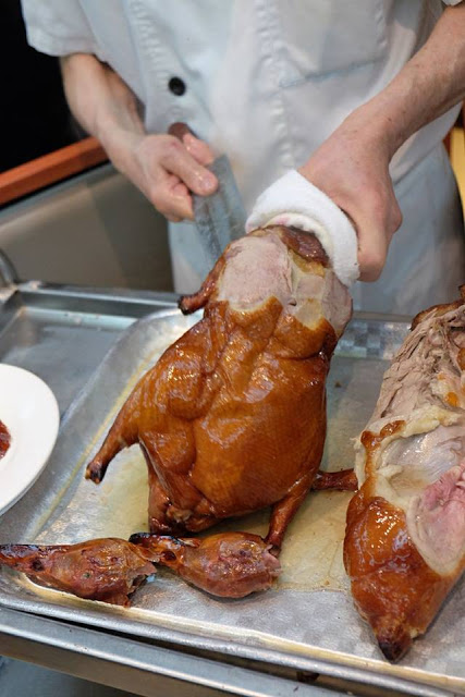 片皮的師傅功多藝熟,就算是冒著煙,依然可以手起刀落,極速切成兩大碟,用薄餅皮包起,加入青瓜絲及海鮮醬,感受一下陣陣鴨皮下脂肪的油香,又有嚼口,味道令人難以忘懷。