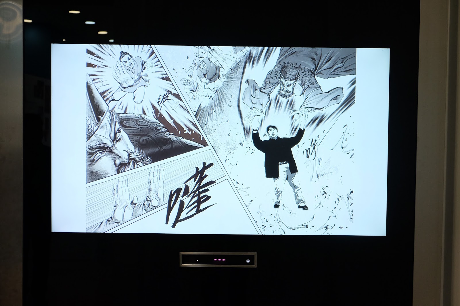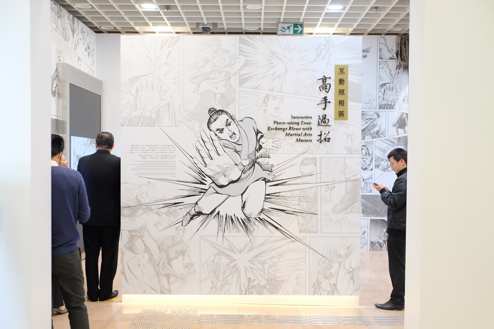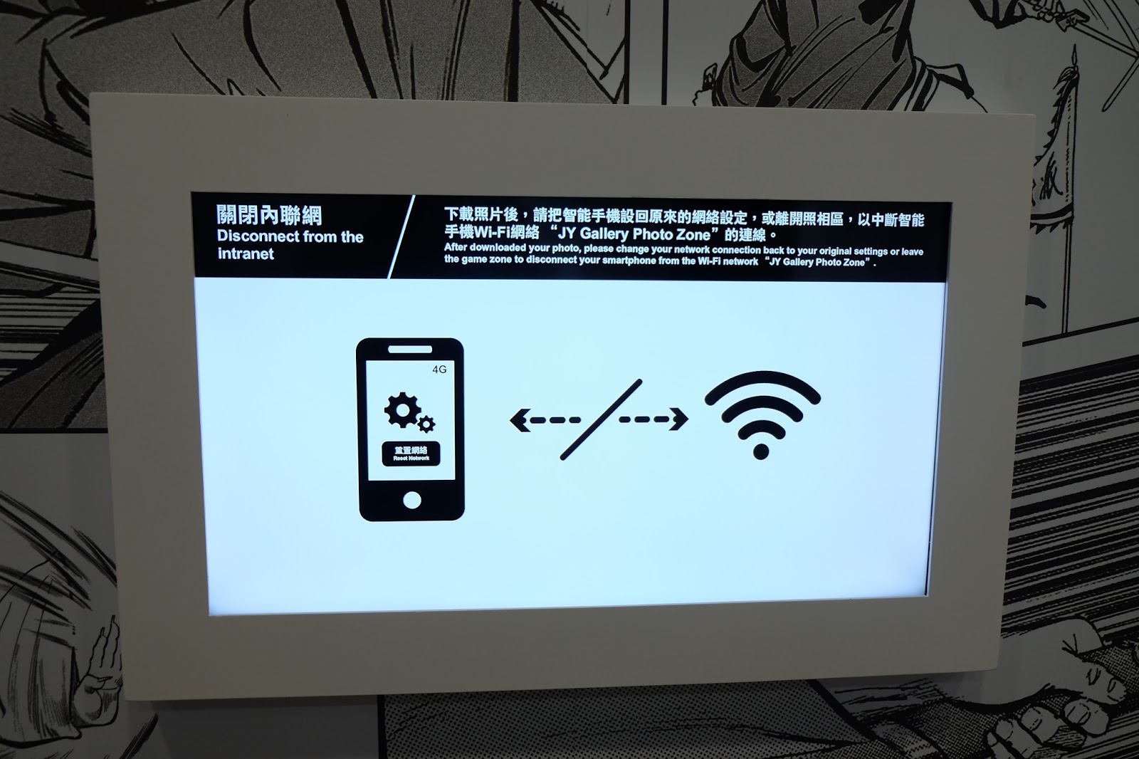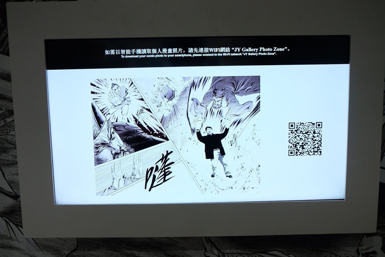 如果單單參觀展品,實在會太悶,展館除了設有電視劇主題曲欣賞,更有一個互動攝影區,遊人先上Wifi,從「JY Gallery Photo Zone」登記,然後站在拍攝區,揮手選出其中一張漫畫,再經電腦合成,最後可以用QR Code download,非常有趣,但幾花時間,要玩就要快手。