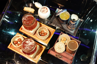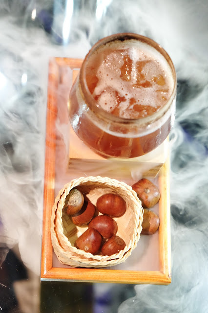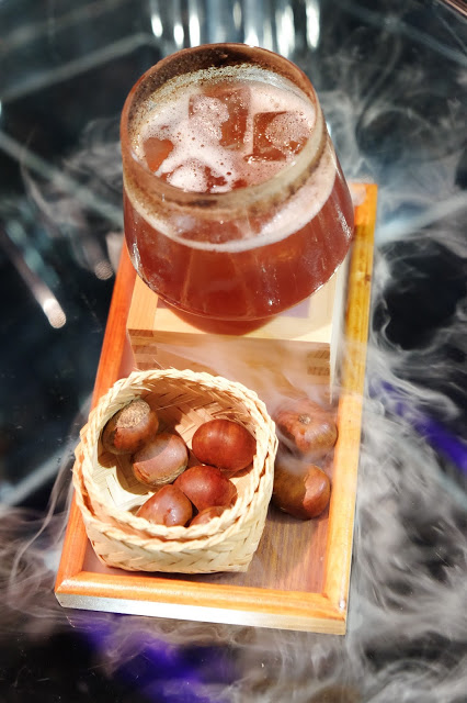 在四杯雞尾酒中,最吸睛的一定是由Vodka、Frangelico、Fig Liquer、檸檬汁、糖漿調製的Temple Street,一放上檯,即時雲霧繚繞、仙氣四溢,賣相一絕,杯邊沾上了梅粉,喝起來,舌尖踫上了梅粉,口感實在特別,伴碟竟然是香甜的栗子,而不是花生,真是有趣的組合。