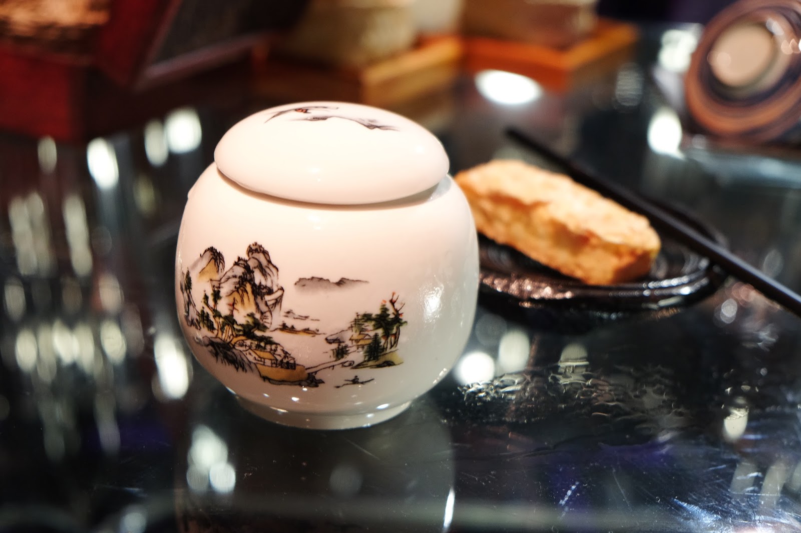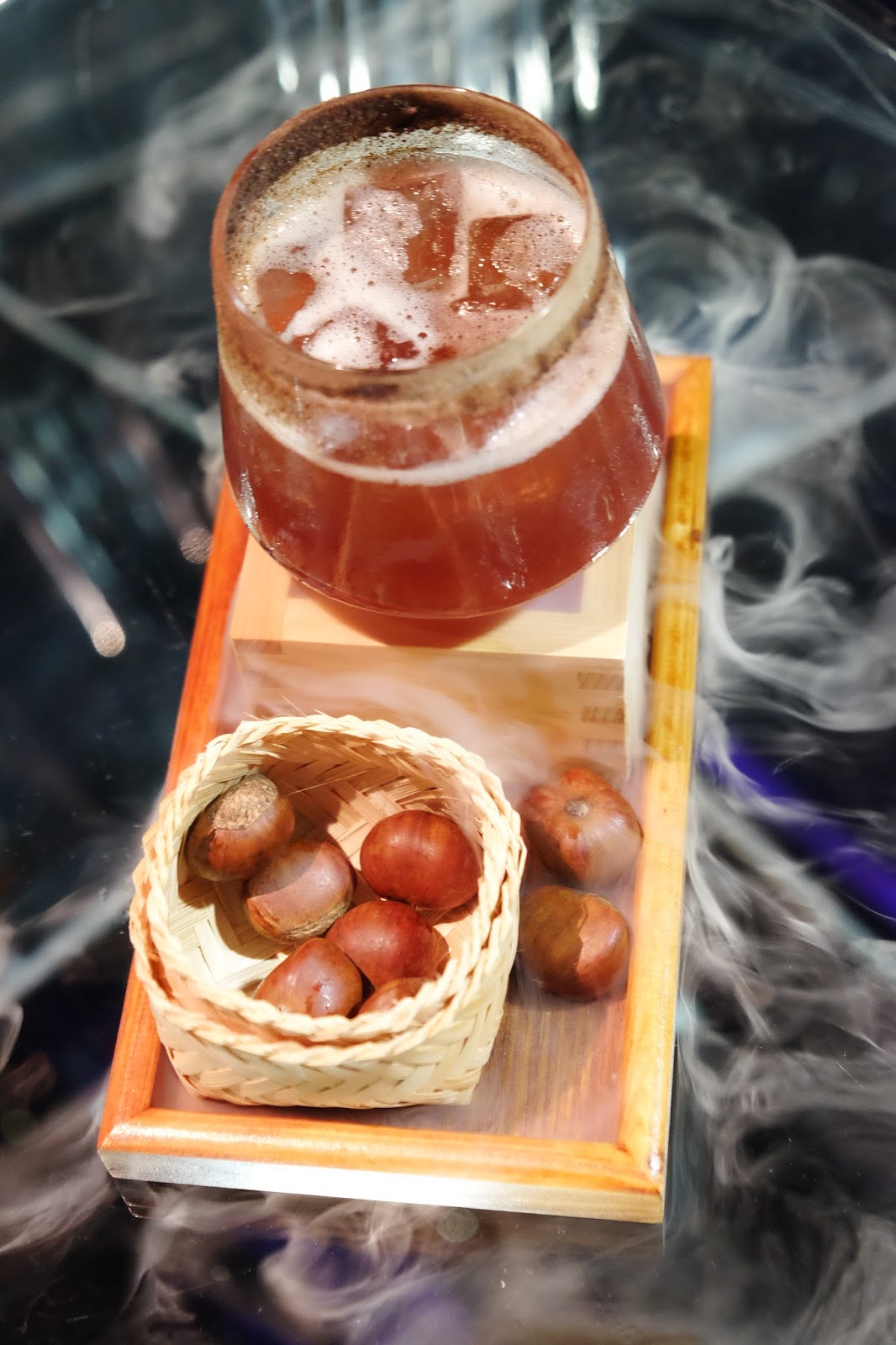 在四杯雞尾酒中,最吸睛的一定是由Vodka、Frangelico、Fig Liquer、檸檬汁、糖漿調製的Temple Street,一放上檯,即時雲霧繚繞、仙氣四溢,賣相一絕,杯邊沾上了梅粉,喝起來,舌尖踫上了梅粉,口感實在特別,伴碟竟然是香甜的栗子,而不是花生,真是有趣的組合。