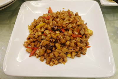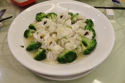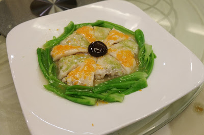 以蛋白作皮,真是非常考功夫,餡料是馬碲、雞肉及冬菇,全都切成碎粒,先炒好,再用蛋白皮包好再蒸,最後埋芡,夾起時,蛋白柔韌有彈性,如果可以再薄身一點就更好。