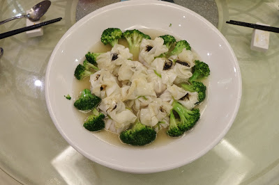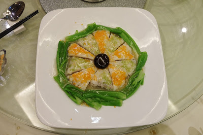 乳鴿肉質細緻嫩滑,釀上墨魚滑後,壓成圓形大餅一樣,蒸熟後埋上玻璃薄芡,入口滑而爽彈。