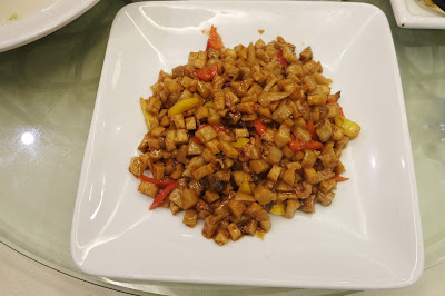 是一道可以拌飯或潮州粥的菜色,以豆乾及肉粒,加入辣椒同炒,芡汁不多,舀少許撈落白粥,簡單而味美,而且又有菜脯及欖菜可以任添,諗起都想食。