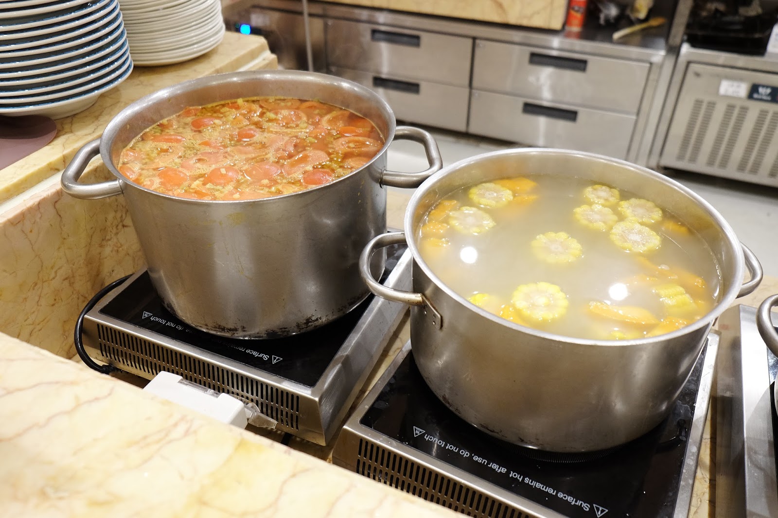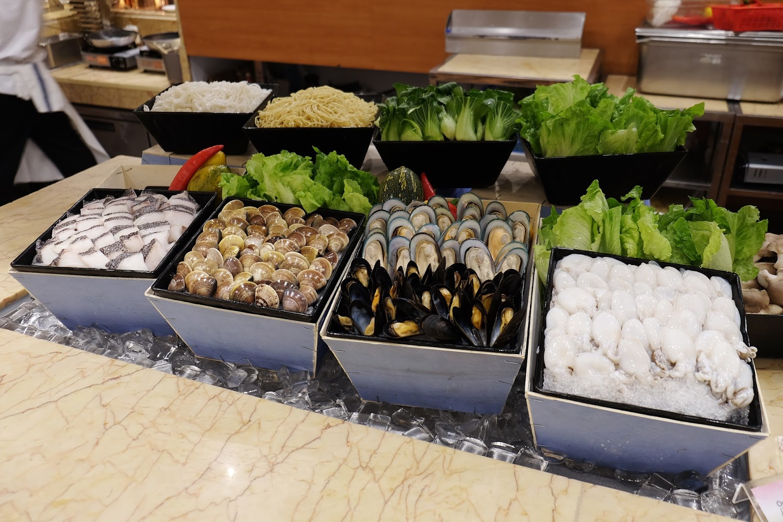 客人可以自選墨魚仔、青口、藍貝、花蛤、比目魚或菜蔬,交由廚師代為灼熟,再澆上南瓜粟米湯或下龍灣海鮮湯,個人兩款都試了,還是覺得後者較香濃。
