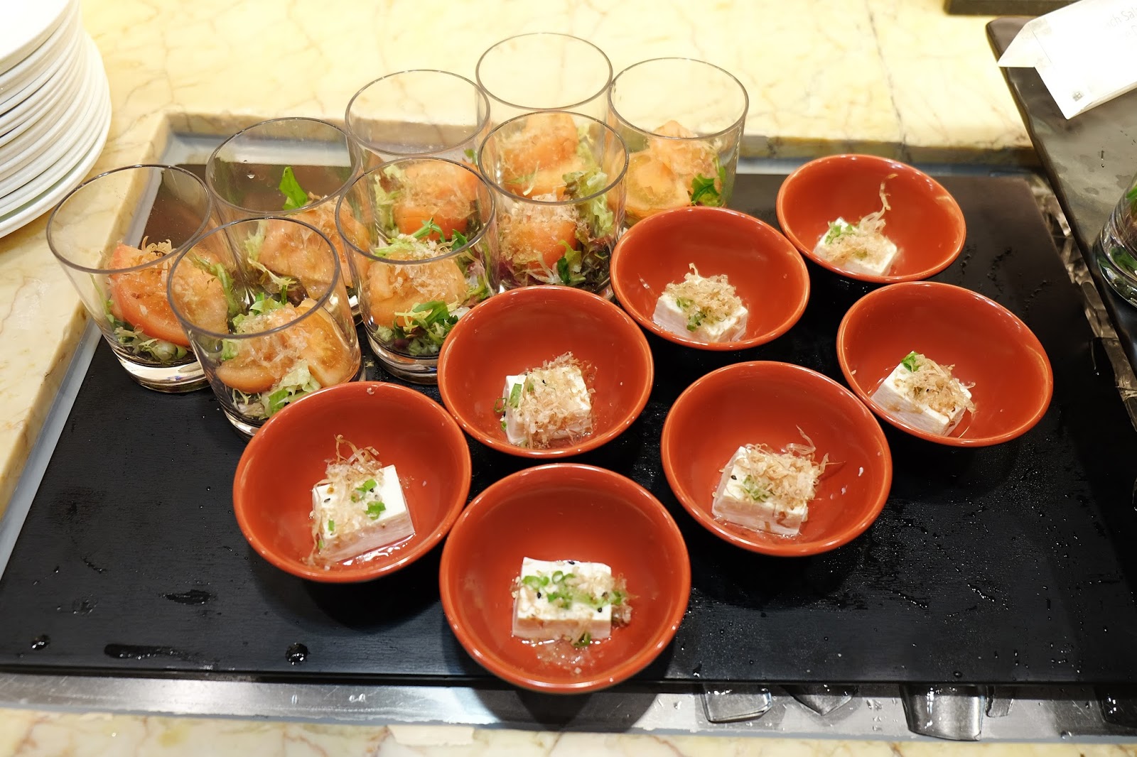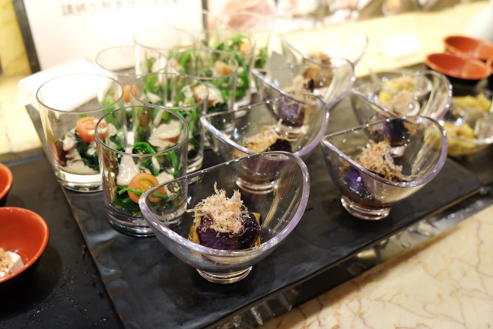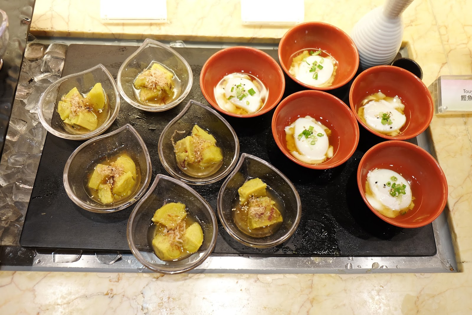 日式薯仔蓉沙律、日式凍番薯、溫泉玉子、醬燒茄子沙律、胡麻醬菠菜沙律、黑醋木耳伴拍黃瓜及胡麻醬油牛蒡,都是具東瀛風,既有清新、又有惹味,花款多多。