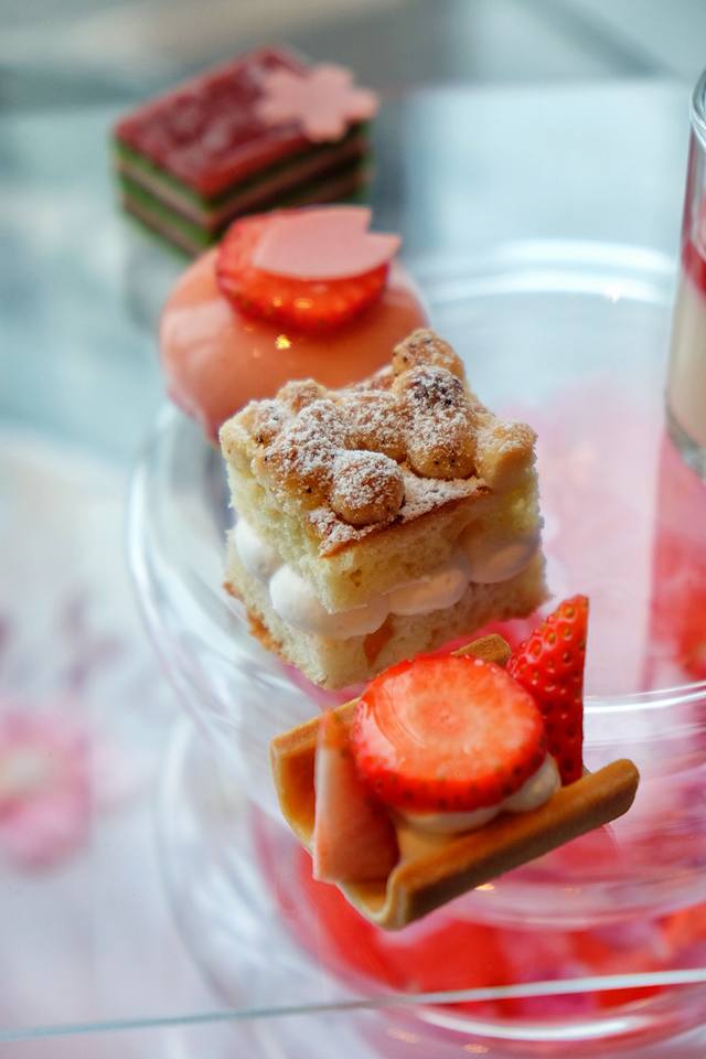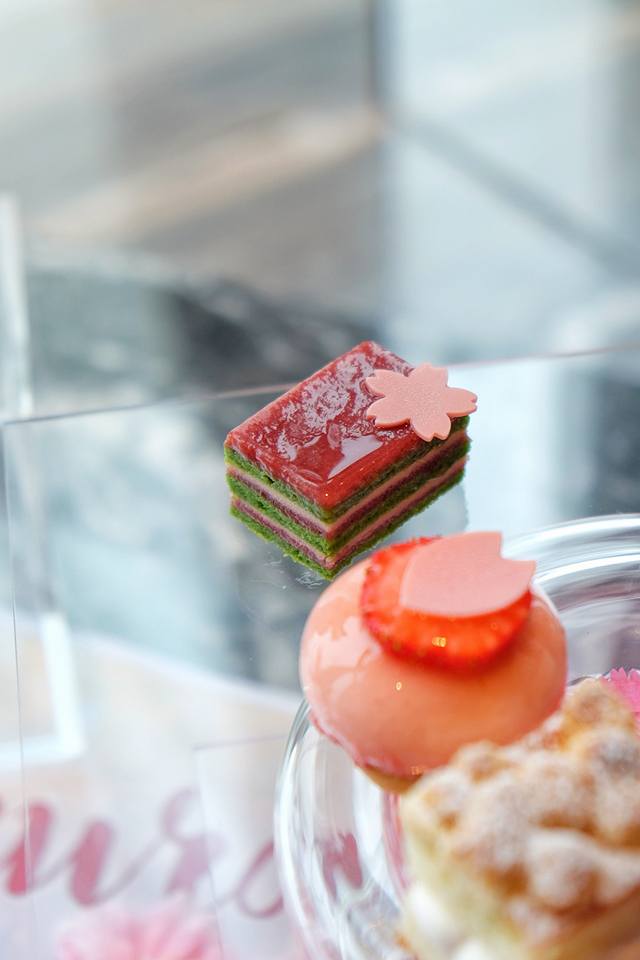 抹茶海綿蛋糕、糖漬草莓與及櫻花慕絲,層層交替,再放上櫻花裝飾,每口都是日本風情。