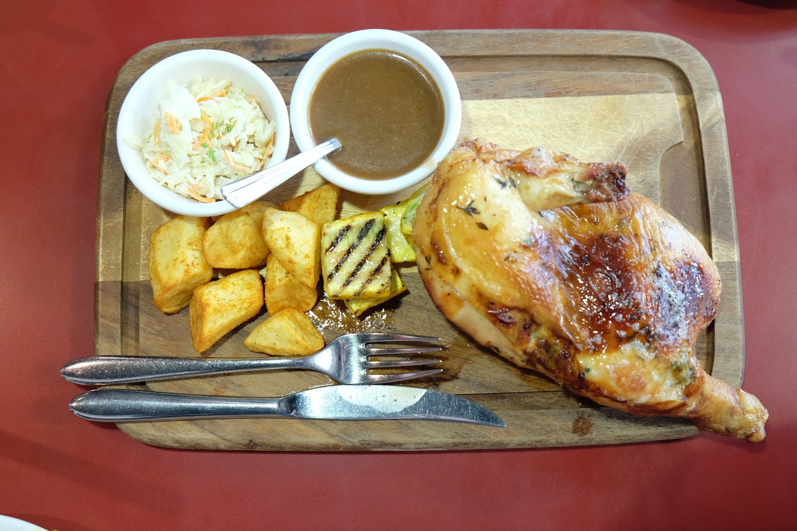 除了部份位置有點結實外,其他部位都啱啱好,雞皮更是香口,蘸點些少肉汁就更惹味,side dishes有迷迭香烤薯角、烤意大利青瓜及椰菜沙律,其實非常豐富,單是這個主菜已經飽了。