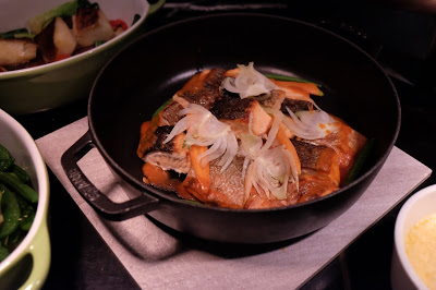 想不到單是魚類已經有清蒸石班、香煎比目魚配紅花柚子汁、香煎三文魚配香茅牛油汁及黑鱈魚配蜜糖麵豉忌廉汁。