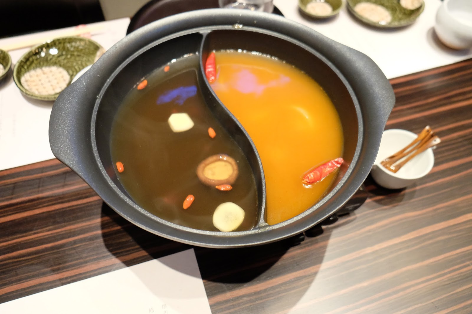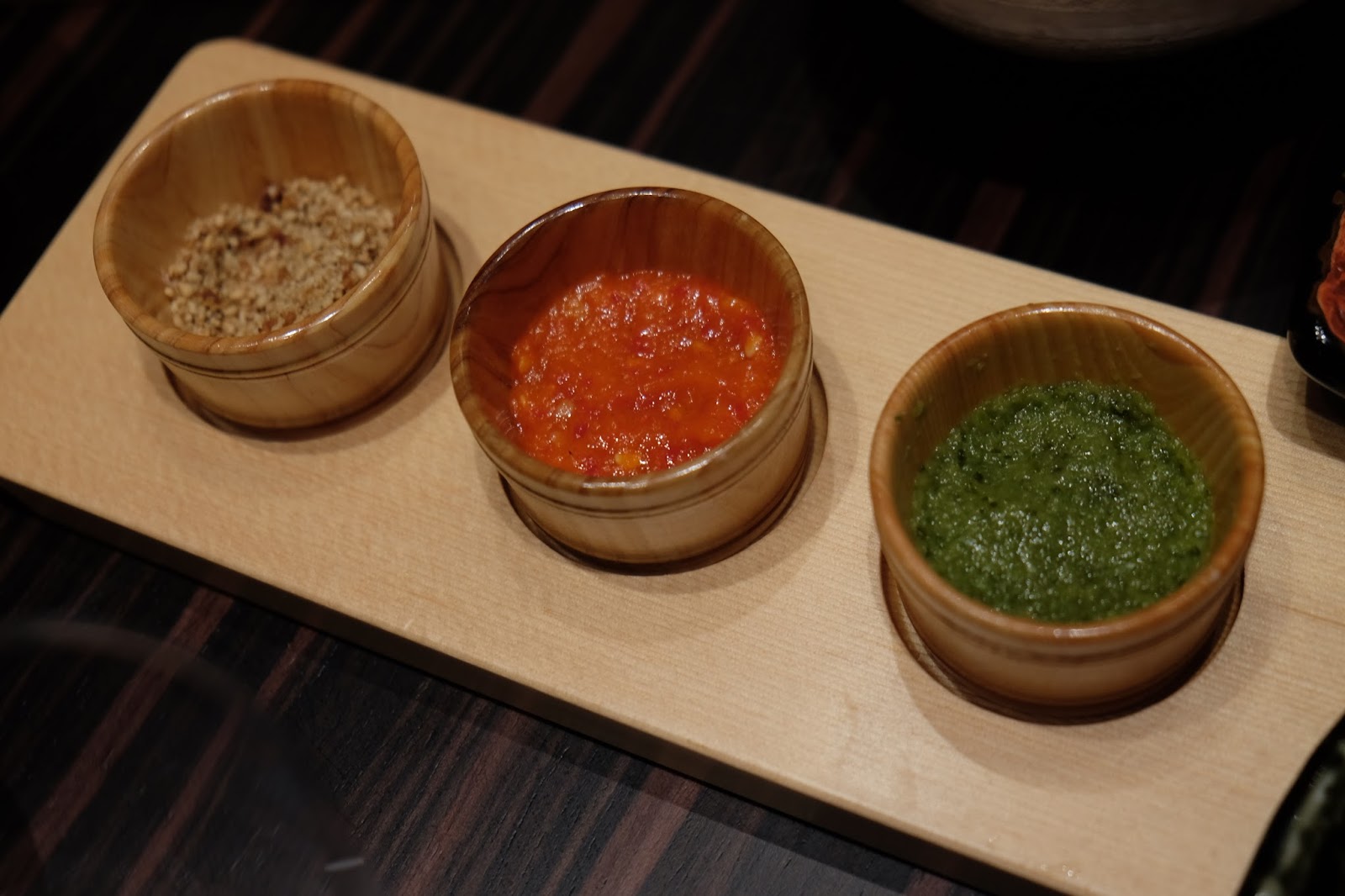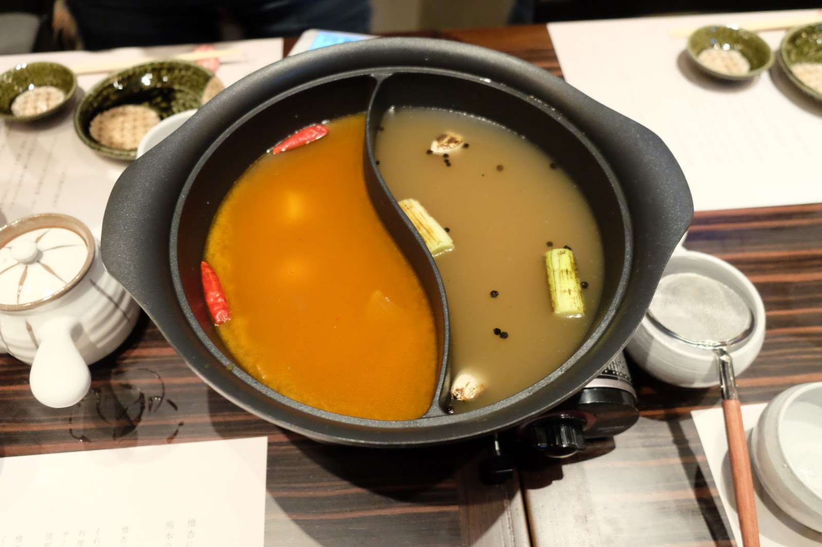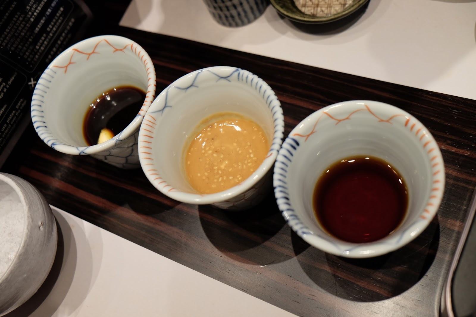 每款涮涮鍋都附上三款醬汁(自家製柑橘醬、焙煎芝麻醬及醬油)與六款調味料(蒜蓉辣椒醬、青柚子胡椒醬、自家製香油生薑醬、小国白蘿蔔蓉、茗荷及白蔥絲和熊本炸蒜及焙煎芝麻) 。