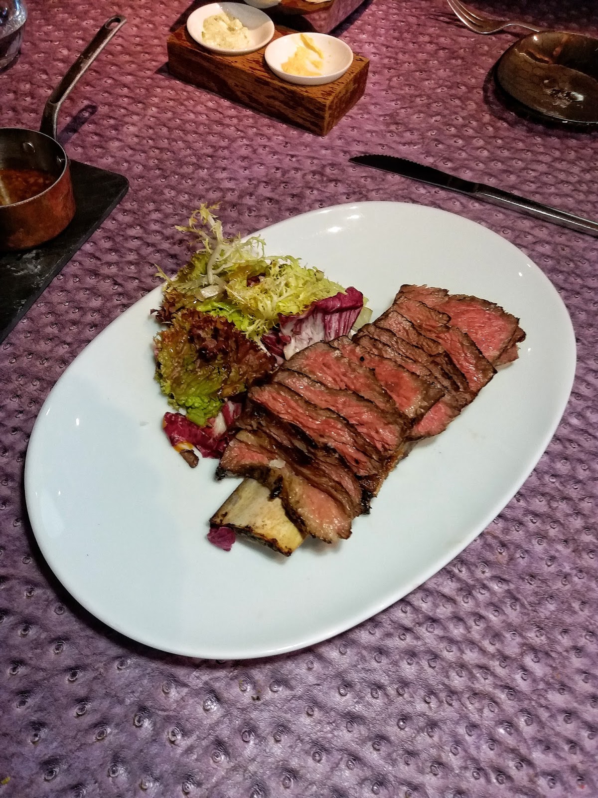 畢竟自己是牛魔王,實在難以擺脫牛肉的誘惑,雖然要另加一百個大洋,但份量毫不留手,足480g,由於是DA牛肋肉,烤至medium rare,中間位仍是嫣紅帶少許血絲,但肉味濃郁,油份位烤至帶點焦香,更是不得了,真心推介。