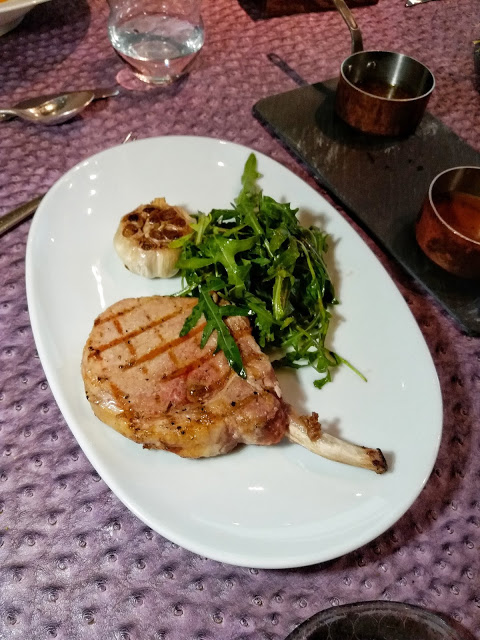 朋友力讚的一道菜,份量十足,足有半吋以上厚度,烤紋清晰可見,邊位略帶脂肪,但充滿了油香,咬落鬆軟富肉味,實在比預期中還要出色,伴碟的蒜頭亦烤得軟稔,陣陣蒜香在口腔徘徊,相當吸引。