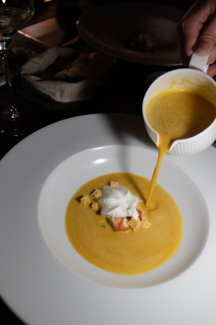 蝦肉與湯是分開上,份量十足,不說還以為是兩人份,舀一下,龍蝦湯很濃稠,而且瀰漫著陣陣龍蝦的香氣,帶些少干邑的香氣,質感滑溜,可以說是近日喝過最好的龍蝦湯。
