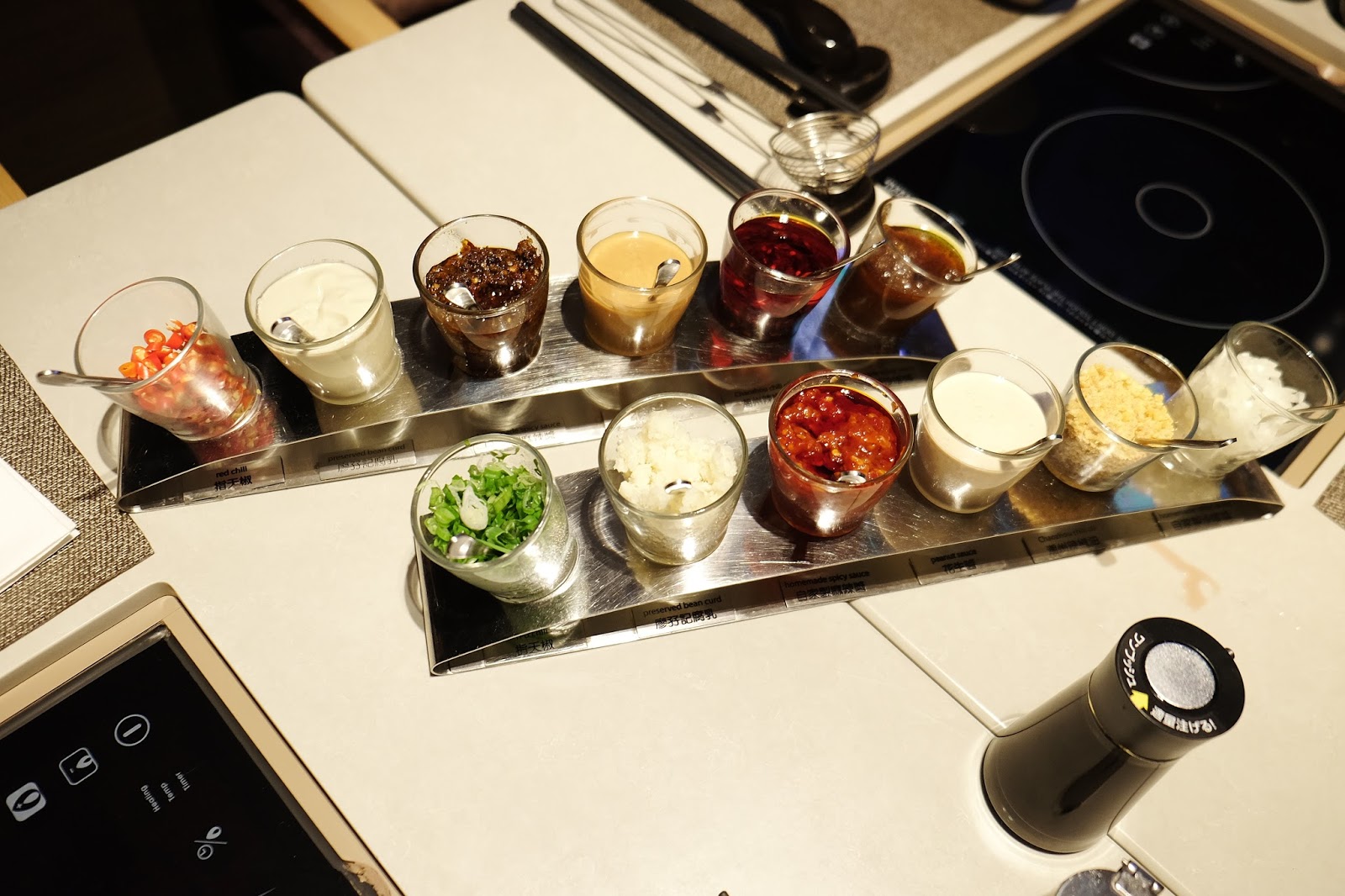 檯面事先擺放了12款固定配料及醬料,包括 蔥花、蒜蓉、豆瓣醬、日式胡麻醬、金蒜粒、鮮洋蔥粒、指天椒、廖孖記腐乳皇、自家製麻辣醬、花生醬、潮州辣椒油及自家製沙嗲醬,比起一般火鍋專門店還要認真及多款式,客人大可任意調製屬於自家口味的醬料。