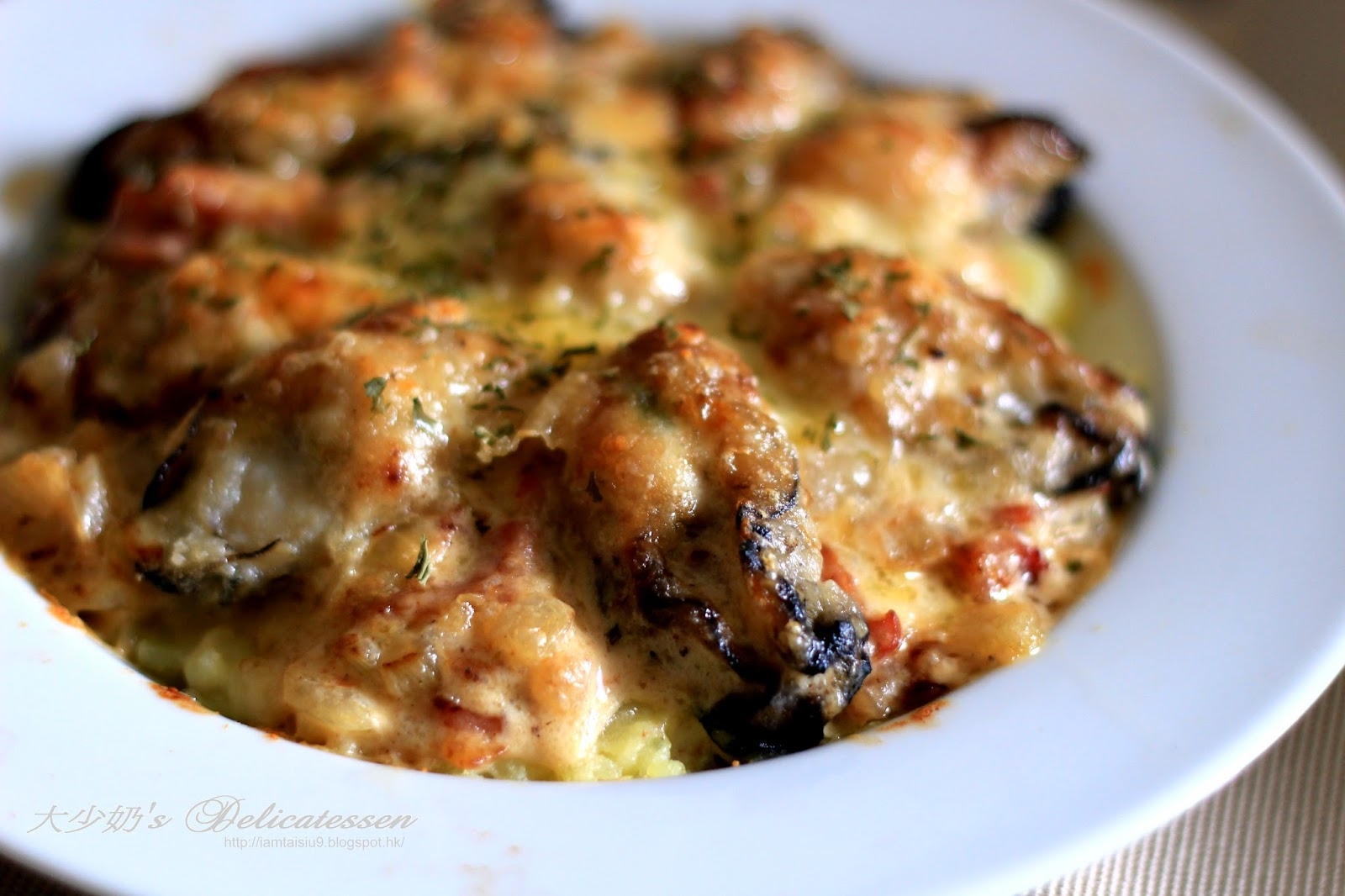 將蠔放上薯蓉面,加上忌廉汁,加芝士,放入200度焗爐焗10~15分鐘或芝士溶轉為金黃色