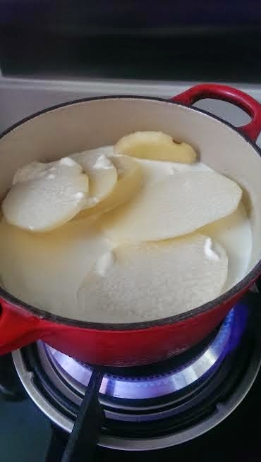 將薯仔切片後加入淡忌廉、奶一齊煮,煲滾後較慢火去煮