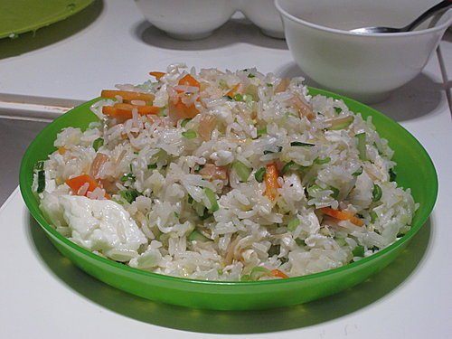 佢示範椒鹽鮮魷、咕嚕肉同蛋白瑤柱炒飯