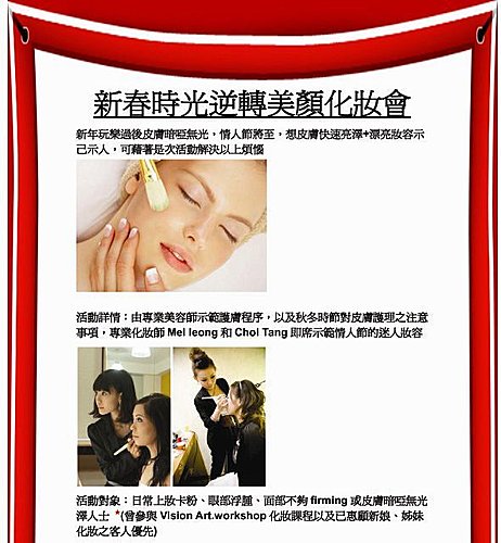 除報紙專欄外,讀者們如一向有關注我「微博」或網誌,在上週五於Vision Art.workshop舉辦了一個新春時光逆轉美顏化妝會。 活動內容以情人佳節(14/Feb)為目標,希望在短短數日內,能幫助各美媚回復皮膚亮澤、毛孔細緻兼擁有漂亮妝容示己示人。 由於反應熱烈,上下午班的名額很快報滿,並邀請專業美容師作示範 美容師教授如何在15分鐘內驅走model暗啞皮膚和縮少面上毛孔 ... 看全文 -