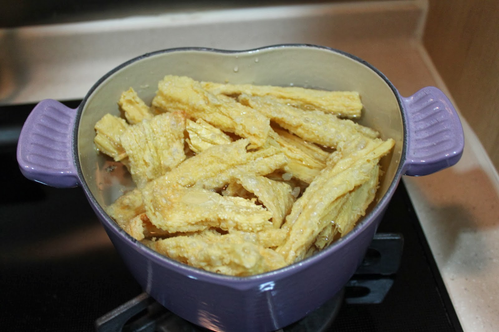 炸枝竹用水浸軟, 備用.