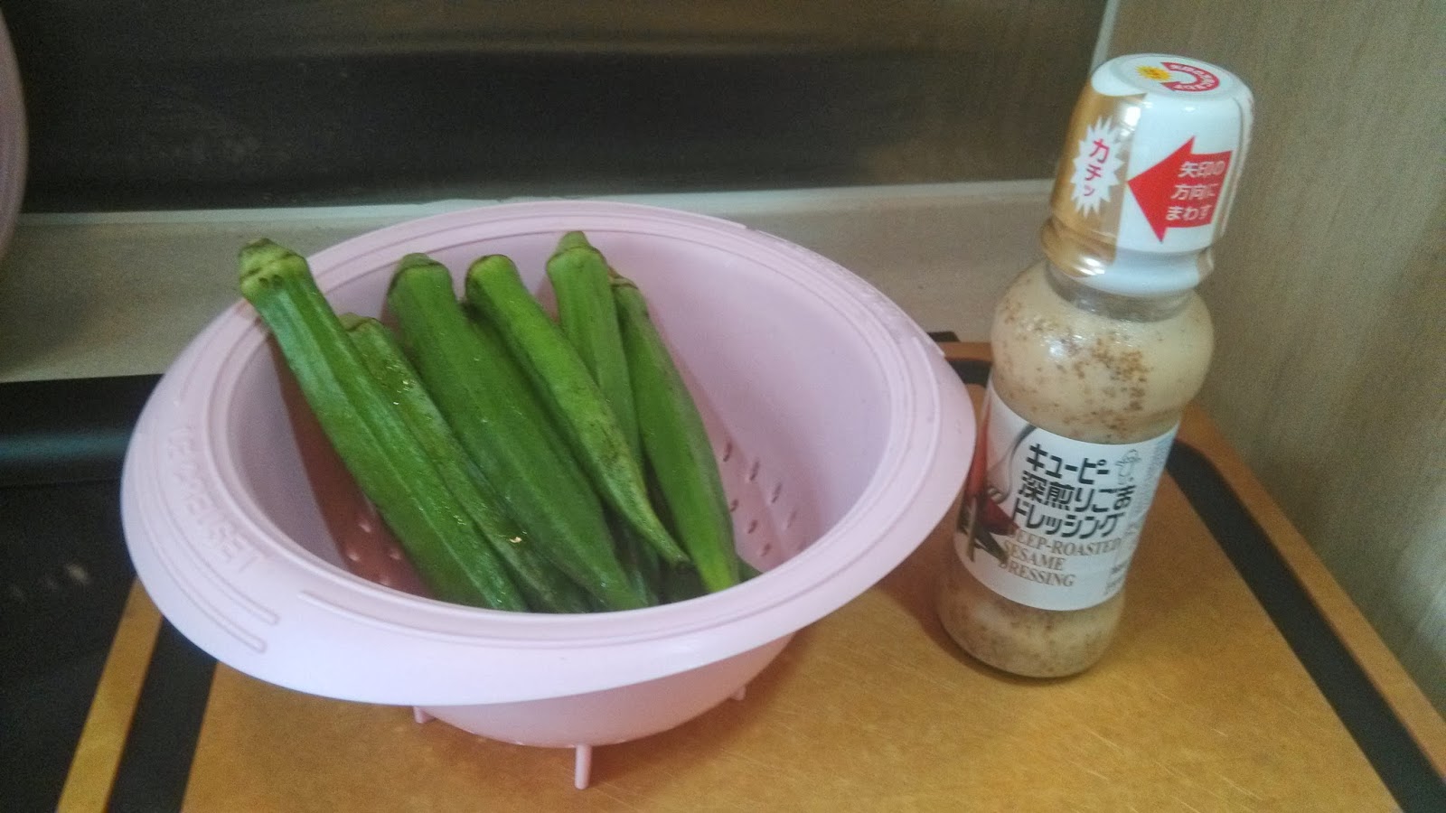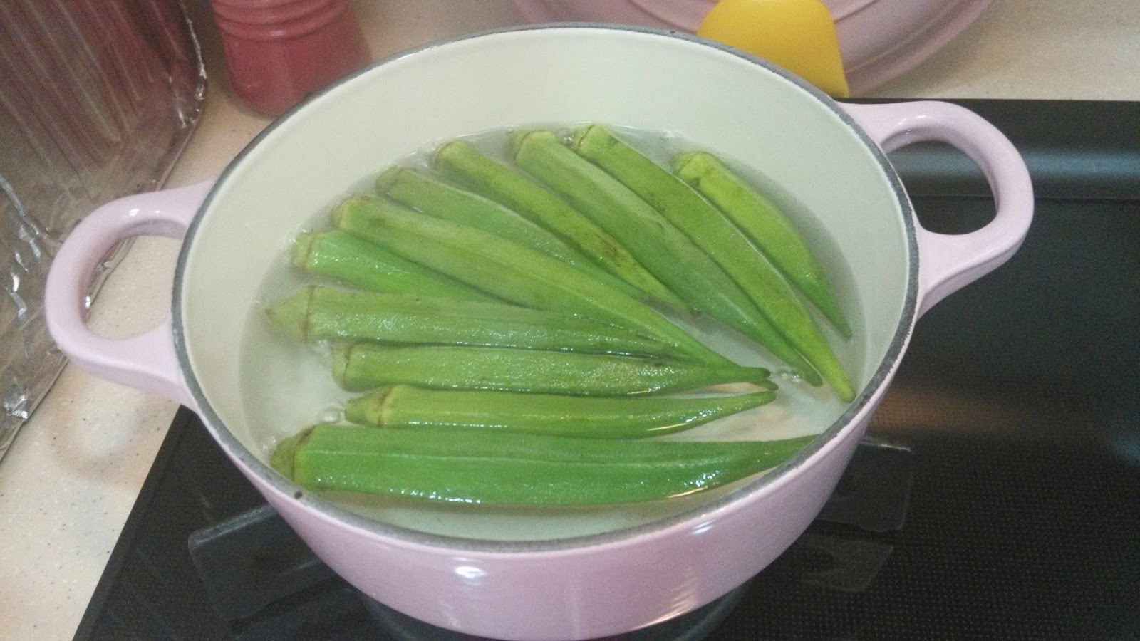 (1) 先把秋葵洗淨, 燒一鍋水, 加入少許鹽, 水滾後, 加入少許鹽, 加入秋葵灼1分鐘.