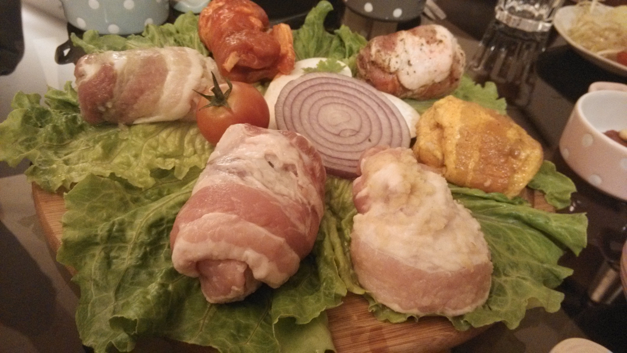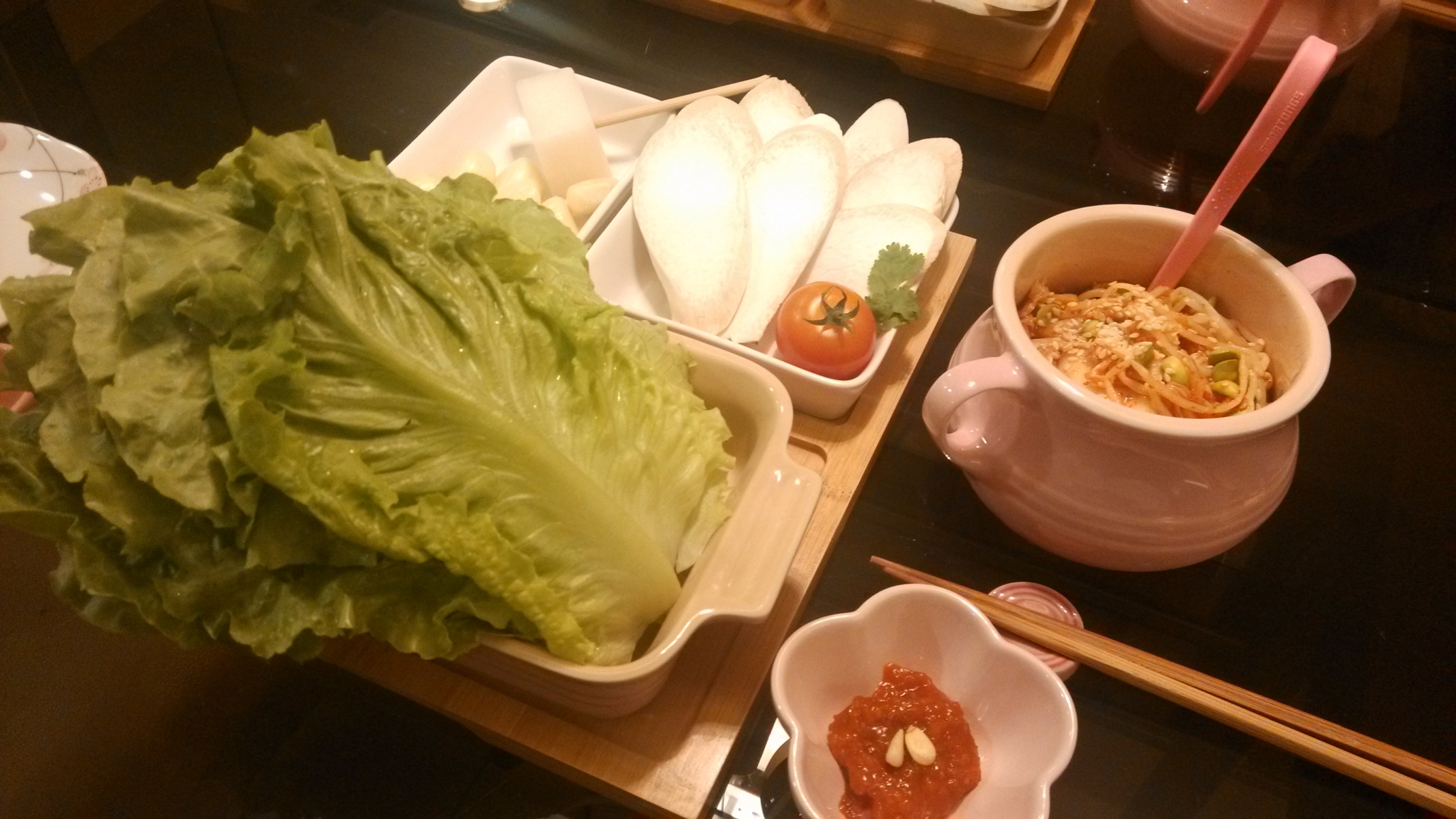 韓式烤肉, 必定會有這些的.....生菜, 菇菇, 蒜頭, 還有巳醃好的泡菜及大荳芽泡菜啊...