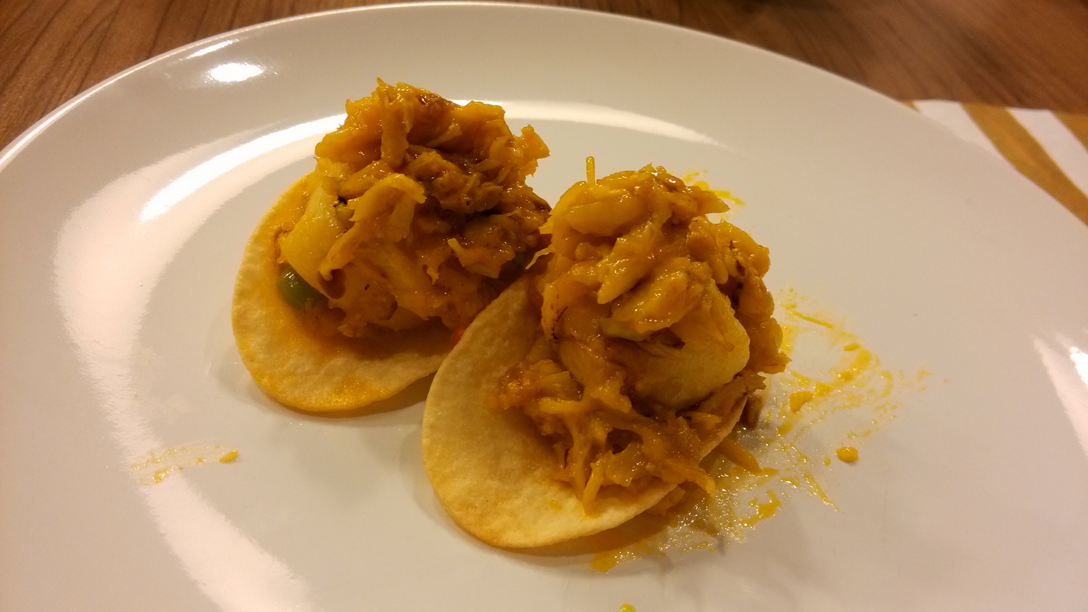 他便想到利用薯片盛著蟹粉及帶子一起吃. 呀, 估不到薯片加蟹粉吃, 又好夾嫁.